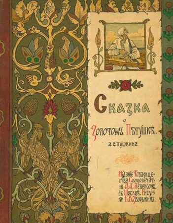 Le motif et la mention « Сказка о золотом петушке » renvoient au « Conte du coq d’or », un conte de Pouchkine adapté en opéra par Rimski-Korsakov et en fil d’animation par Alexandra Snejko-Blotskaïa.