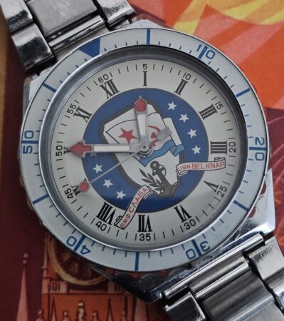 Motif du cadran : Ancre et rameau d’olivier, surmontés du pavillon de la marine de guerre soviétique, encadrés d’étoiles, avec un bandeau : Вмф Cлава / USS Belknap