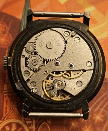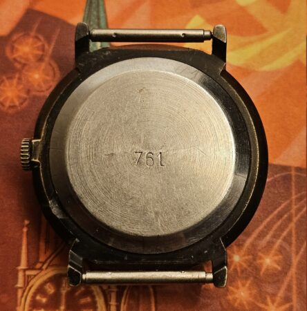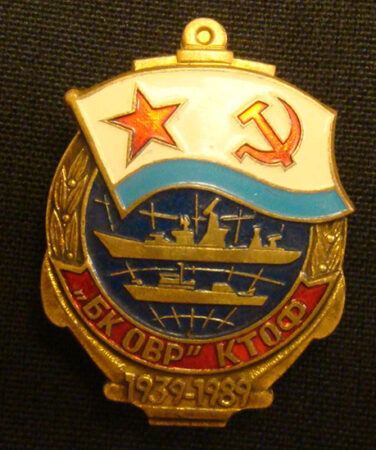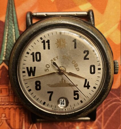 Montre commémorative des 50 ans des Бригада кораблей охраны водного района (Brigades de navires de protection des eaux). Ces brigades se trouvent dans les 4 flottes (du Nord, Baltique, Mer Noire, Pacifique) et dans la flottille de la mer Caspienne. Sur le cadran se trouve la mention « 50 лет ЬК ОВР » et la silhouette d’un bateau (sans doute un dragueur ou chasseur de mines ou un navire anti sous-marin). Une rose des vents à 12 heures et les lettres W[est] et O[st] à 9 et 3 heures.
