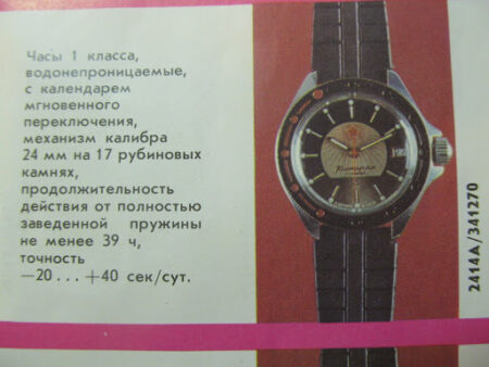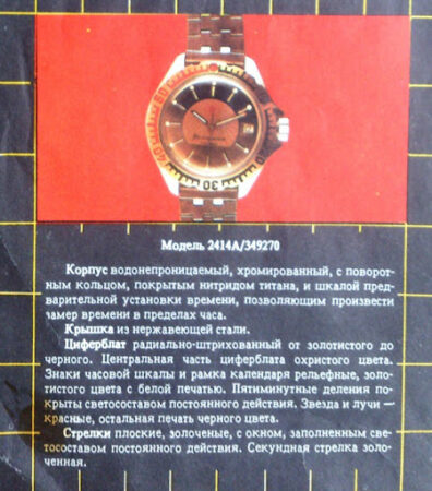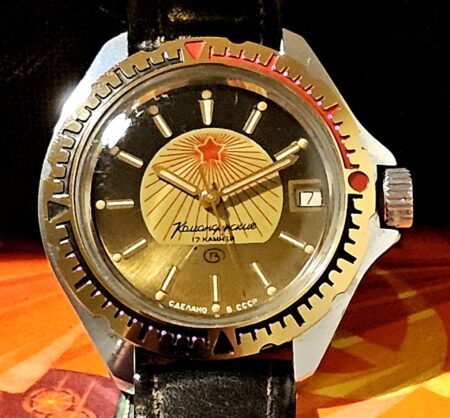 Remarque : La Kommandisrskie « rising star » (parfois appelée « rising sun ») est un modèle très apprécié des collectionneur a été fabriqué de 1989 à 1993 (mais les modèles Сделано в СССР jusqu’en 1991). L’essentiel de sa production a été exporté, surtout en Italie et aux USA. Aux USA, c’est la société américaine TimePeace Russian Watch « Vremir »Vremir qui l’a importé à partir de 1991. Voir ici une Rising star Vremir.