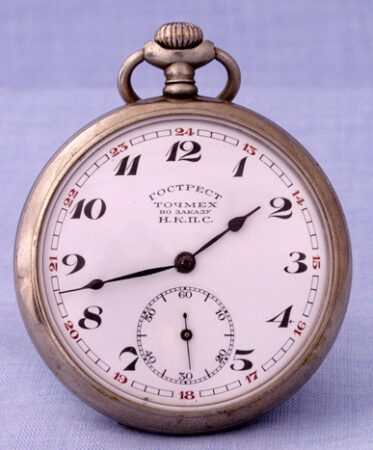 Montre de poche produite dans les années ’20 par le Gostrust Tochmekh. pour le NKPS (НКПС, Наро́дный комиссариа́т путе́й сообще́ния СССР), le Commissariat du Peuple aux Communications (qui avait notamment en charge les chemins de fer).