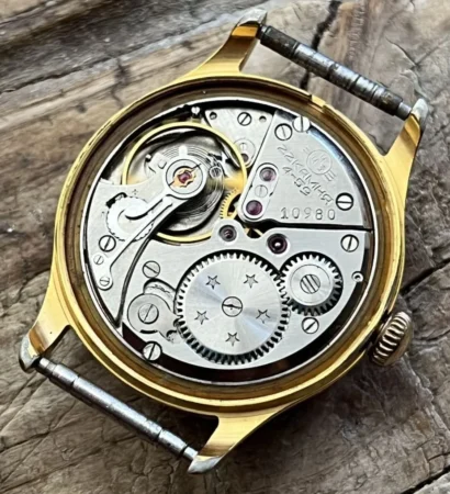 Mentions sur le calibre : n° de série (10980), premier logo Vostok (initiales dans un cercles avec des triples traits) 22 камня (22 rubis) et 3-59 (4e trimestre 1959) sur un pont.