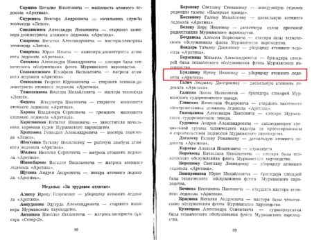 Extrait du livre « Vers le pôle! » (к полюсу!) ou est listé l’équipage, qui, outre la montre, a été décoré de l’Ordre du Travail.