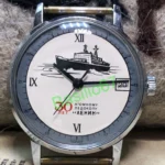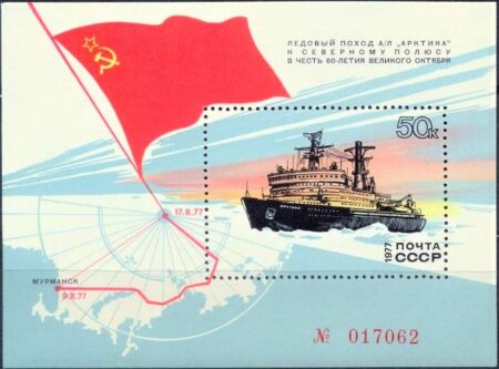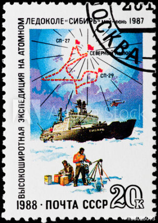 En 1987, le « Sibir » a effectué un trajet sans précédent dans les hautes latitudes pour prendre à bord le personnel de la station scientifique en dérive SP-27 et en déployer une autre, SP-29, avant d’atteindre le pôle Nord à des fins scientifiques. C’est le motif du cadran, c’est aussi ce qui est célébré par ce timbre: