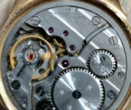 Mentions sur le calibre : 16 камней et logo de la fabrique (les initiales ПЧЗ inscrites dans un losange) sur un pont, cinq étoiles sur le rochet, côtes de Genève.