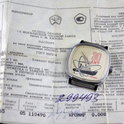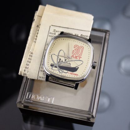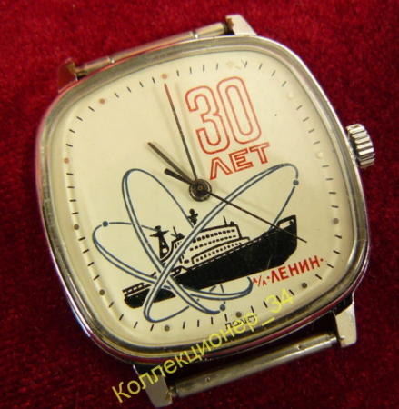 Le cadran porte la mention «30 лет а[томномy]/л[едоколy] « Ленин »»: «30 ans du b[rise-glace]/a[tomique] « Lénine »»