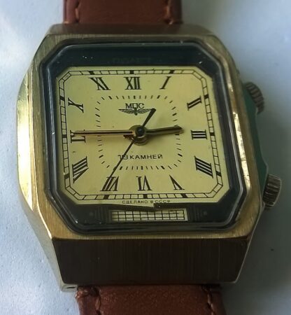 Cadran à la marque du Ministère des chemins de fer de l’URSS (Министе́рство путе́й сообще́ния СССР – МПС СССР) et à six heures un motif évoquant un haut-parleur et les mentions 18 камней (18 rubis) et cделано в cccp (fabriqué en URSS).