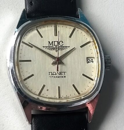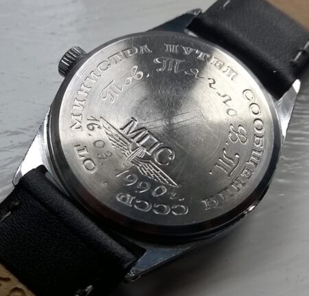 Montre bracelet, mécanique, à simple tantième, à la marque du Ministère des chemins de fer de l’URSS (Министе́рство путе́й сообще́ния СССР – МПС СССР) de la 1ère Fabrique de Montres de Moscou