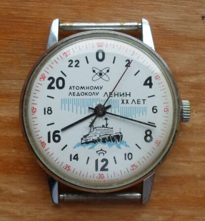 Cette montre-bracelet « 24 heures » date de 1979 de la Fabrique de Montres de Petrodvorets commémore le 20e anniversaire du brise-glace nucléaire « Lénine » (lancé en 1957).