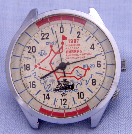 En 1987, le « Sibir » a effectué un trajet sans précédent dans les hautes latitudes pour prendre à bord le personnel de la station scientifique en dérive SP-27 et en déployer une autre, SP-29, avant d’atteindre le pôle Nord à des fins scientifiques. C’est le motif du cadran, c’est aussi ce qui est célébré par ce timbre: