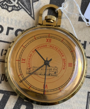 Motif sur le cadran : Locomotive et mention « Байкало-Амурская железная дорога », soit Chemin de fer Baïkal-Amour