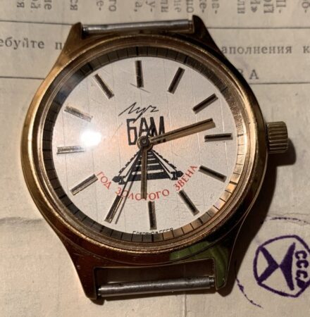 Motif sur le cadran : voie ferrée et mention БАм (pour « Байкало-Амурская железная дорога », soit Chemin de fer Baïkal-Amour) et « год золотой звена » (« année du lien d’or »)