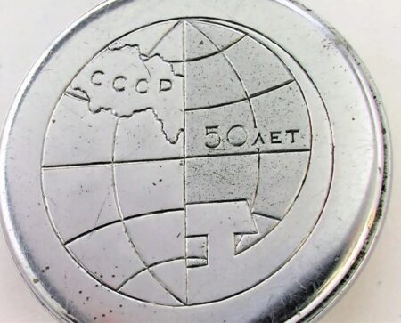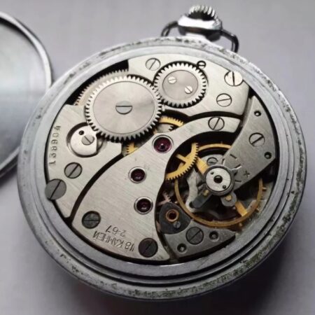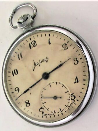 Montre de poche type « savonnette » produite par la Fabrique de Montres de Tcheliabinsk avec un fond commémorant les 50 ans de la Révolution d’octobre.