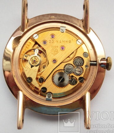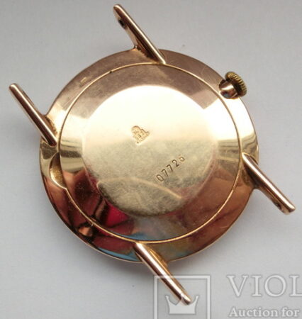 Boîtier en or (poinçon 583 au dos – voir ici pour les poinçons soviétiques) à fond clipsé, avec le n° 07726.