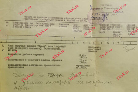 Le mécanisme destiné à la montre était le Slava 1809A à 18 rubis. Les spécificités de la montre exigeaient un fonctionnement après remontage d’une durée d’au moins 40 heures, d’une étanchéité assurant un fonctionnement normal à une profondeur de 50 m (20 atm). Des prototypes ont été fabriqués en 1969.
