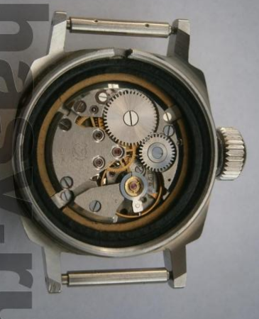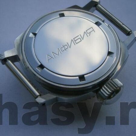 Le seul exemplaire connu emboite curieusement un mécanisme 1814. Ce mécanisme n’a été produit en série que par la Fabrique de Montres de Minsk, a bien été produit ici par la 2e Fabrique de Montres de Moscou – en tout cas il porte son logo. L’étrangeté de la présence de ce 1814 tient à ce que le 1814 se distingue du 1809 par un dateur, et que l’Amphibia en question n’a pas de guichet pour l’affichage de la date…