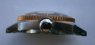L’anneau du boitier et le fond sont en acier inoxydable, l’entre-cornes de 14mm: