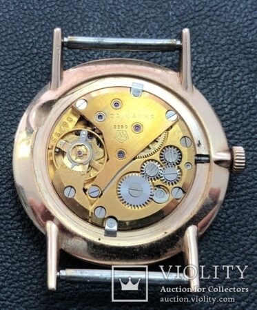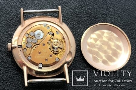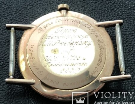 Boîtier de laiton plaqué or (poinçon 583 au dos – voir ici pour les poinçons soviétiques) à fond clipsé, avec la dédicace au nom du récipendiaire.