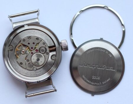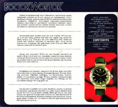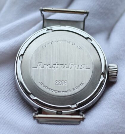 Gravure sur le fond : 2209, Амфибия, водонепроницаemыe 200M (étanche à 200 mètres), противоударные (antichoc), Aвтоподзавод (remontage automatique).