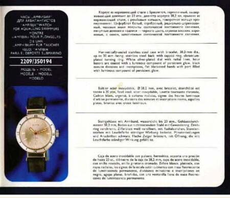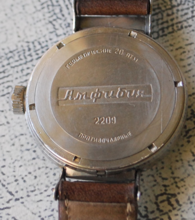 Gravure sur le fond : 2209, Амфибия, водонепроницаemыe 200M (étanche à 200 mètres), противоударные (antichoc), Aвтоподзавод (remontage automatique).