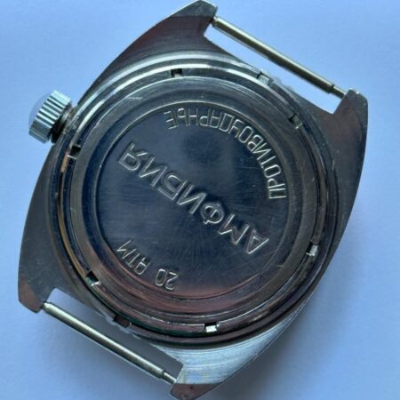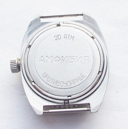 Gravure sur le fond : Амфибия, 20ATM (20 atmosphères), противоударные (antichoc).
