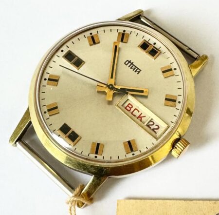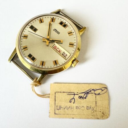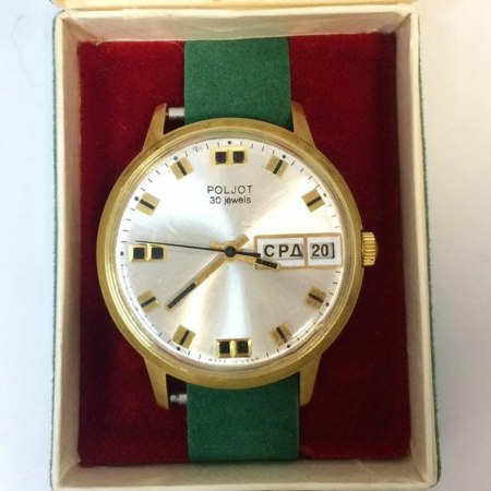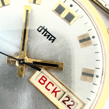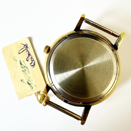 Prototype de l’institut NII Chasprom pour ce qui sera montre bracelet Poljot 2627/1193313 produite par la 1ère Fabrique de Montres de Moscou. Boîtier en laiton plaqué or à fermeture à bague (6 mors).