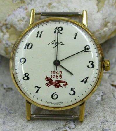 Montre -bracelet, mécanique, comémorative « 1945-1985 », plaquée or, de la Fabrique de Montres de Minsk