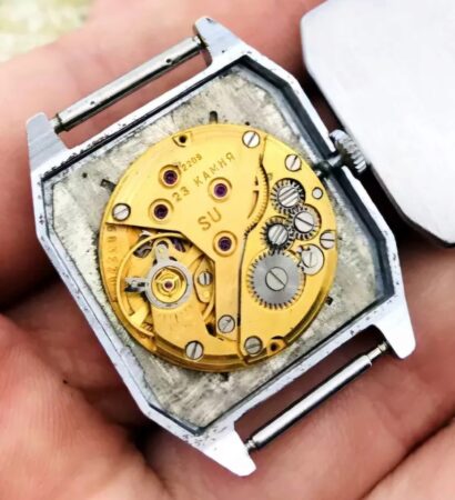 Mentions sur le calibre : N° de série sur la platine, 2209 , SU (Soviet Union) et 23 камней sur un pont