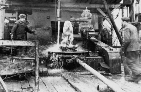 En 1945, le Bachneftekombinat a été transformé en association Bachneft. Tous les travaux de prospection géologique, de forage et de production furent confiés à la nouvelle association Bachneft. Elle comprenait les trusts Ishimbayneft (le tout premier), Tuymazaneft, Bachnefterazvedka, Bachneftestroy, la fabrique de construction de machines d’Ishimbay et l’Usine Krasny Proletariy (Prolétaire rouge). Bachnefteproekt et Bachteksnabneft. Dans les années d’après-guerre, l’entreprise connaît un développement rapide. Cette période a vu des événements importants tels que la découverte de nombreux gisements à l’ouest et au nord-ouest de la république. En 1949, Serafimovskoye a été découvert, en 1953, le champ Chkapovskoye a été découvert, en 1955 – Arlanskoye, Mancharovskoye, etc. L’entreprise est devenue un terrain d’essai pour l’introduction des dernières technologies dans l’industrie pétrolière : pour la première fois dans l’histoire du pays, un système de maintien de la pression du réservoir a été utilisé sur le champ de Tuymazinskoye. , en injectant de l’eau dans la formation, ce qui a permis d’augmenter considérablement le facteur de récupération du pétrole. En 1954, l’association occupa la première place en URSS parmi les associations productrices de pétrole. En 1967, l’association a atteint le volume maximal de production pétrolière de toute son histoire – environ 48 millions de tonnes de pétrole par an. Le 4 juillet 1980, PO Bachneft célèbre la production de sa milliardième tonne de pétrole.