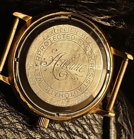 Gravure sur le fond WATERPROTECTED SHOK-RESIST avec une gravure personalisée: « Моей любимой жене Альбине в день ее рождения – 1970 » – « À ma femme bien-aimée Albina pour son anniversaire – 1970 »