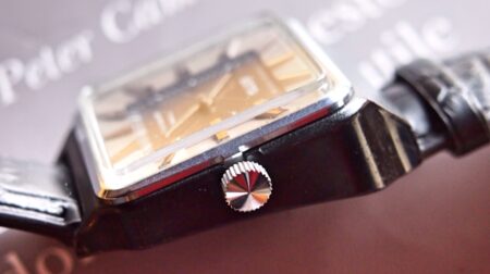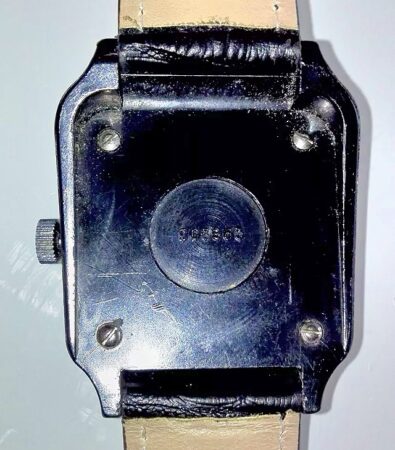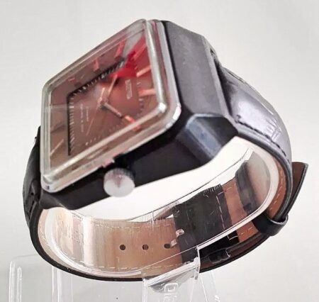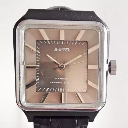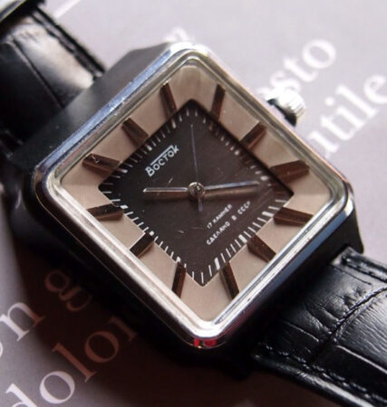 Ce modèle est la variation d’un modèle existant au design particulier, avec un boitier incliné. Sur ce modèle original le boitier est en plastique et il emboite un Vostok 2409 à 17 rubis (photos: russian-watches.it)