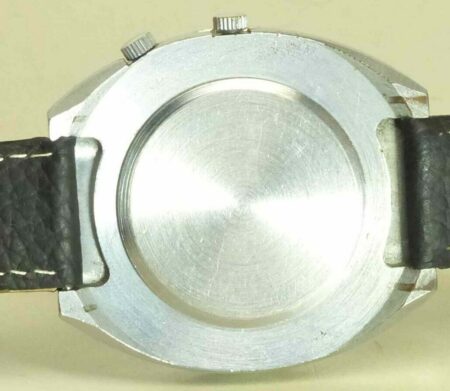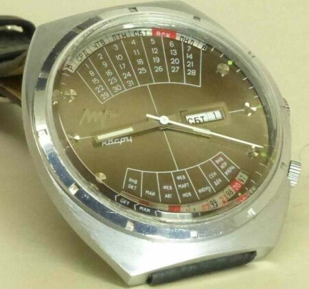 Montre à quartz et à calendrier perpétuel de la Fabrique de Montres de MinskMécanisme à quartz 2350 à 7 rubis marqué L2350Diamètre: 43 mmÉpaisseur: 11 mmProduite au début des années ’90Disque allant de 1988 à 2032