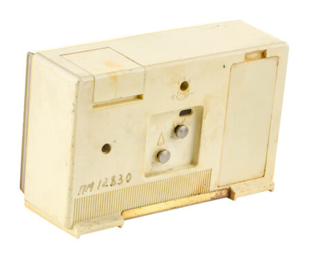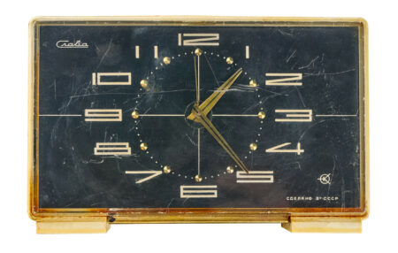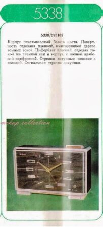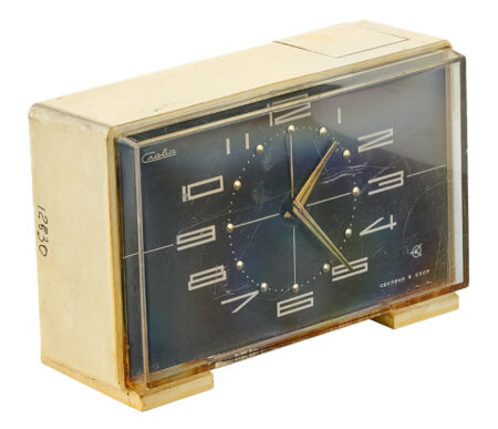 Réveil matin électro-mécanisme que le 2e Fabrique de Montres de MoscouMarque: SlavaMécanisme: 5338Production: De la fin des années aux années ’80Hauteur: 100 mmLargeur: 153 mmProfondeur: 60mm
