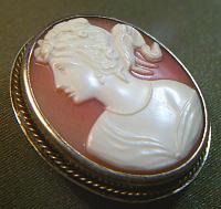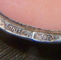 On retrouve ce poiçon sur les bijours de la fabrique. Ci-dessous, un camée qui porte aussi le poinçon « 875 » (875/mille) inidiquant le taux de l’argent. voir ici les poinçons soviétiques pour l’or et l’argent.