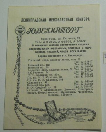 Le LeningradskiYouvelirTorg, qui allait recueillir tout le savoir-faire de la tradition d’orfèvrerie petersbourgeoise, dont l’atelier Fabergé, produisait des bijoux, des bracelets et des montres en or et en argent. Ses principaux organisateurs étaient Gennady Konstantinovich Pavlov, Vasily Nikolaevich Korolkov, Alexander Filippovich Klenov, ses maitres orfèvres et horlogers Mikhail Evseevich Zeldin, Boris Mikhailovich Fradkin et Chistyakov. Elle employa jusqu’à 2000 travailleurs.