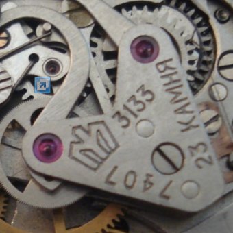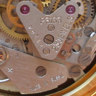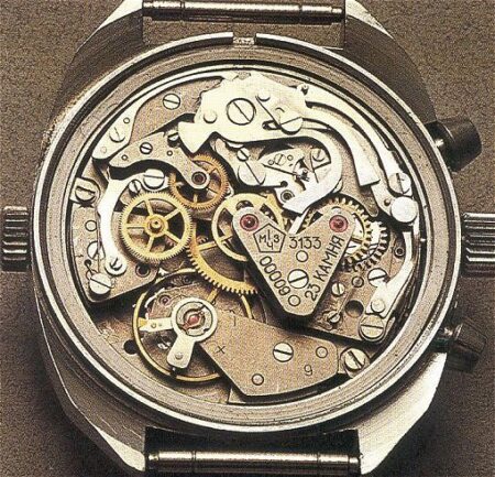 L’absence de couronne Poljot sur la platine et la tête de bouton de déverrouillage de la tige en saillie sont les deux caractéristiques qui permettent de dater un mouvement des premières années de production. De plus, si l’on prend en compte les numéros de série supérieurs à 5000, il n’est pas difficile d’imaginer des mouvements avec ces marquages sur le pont jusqu’au début des années 80. Selon certaines sources, la production du chronographe 3017 était d’environ 5000 unités par an, et il n’y a aucune raison de croire que ce chiffre était beaucoup plus élevé pour les chronographes 3133 d’avant 1989.