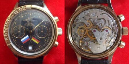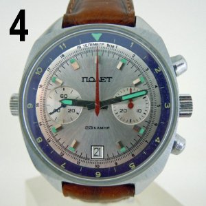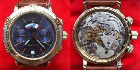 Le chronographe (2) au centre de l’image ci-dessous est identique à celui qui aurait été porté par Gorbatko lors du vol Soyouz 24 entre le 7 et le 25 février 1977. D’une manière ou d’une autre, il a réussi à se frayer un chemin dans le catalogue de Poljot de 1992. Malheureusement, je n’ai aucune preuve suggérant que les anciens cadrans Sans Serif aient survécu jusqu’aux années 90. Par conséquent, Polmax3133 suppose que (en l’absence d’une image du modèle plus récent [c’est-à-dire avec une police de type Serif]) une image plus ancienne d’un catalogue précédent a été utilisée à sa place.