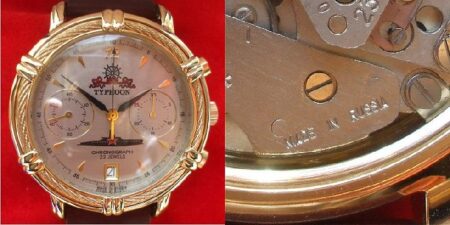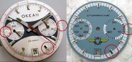 Les faux cadrans d’Okean et de Stourmanskie sont fréquents. Le moyen le plus simple de savoir si le cadran est une reproduction est de vérifier la couleur, la texture et le volume de la matière luminescente. Deux faux cadrans: