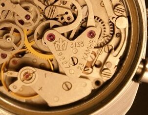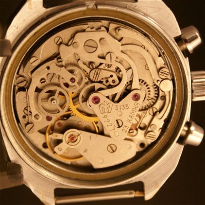 -Des roues de chronographe dorées.