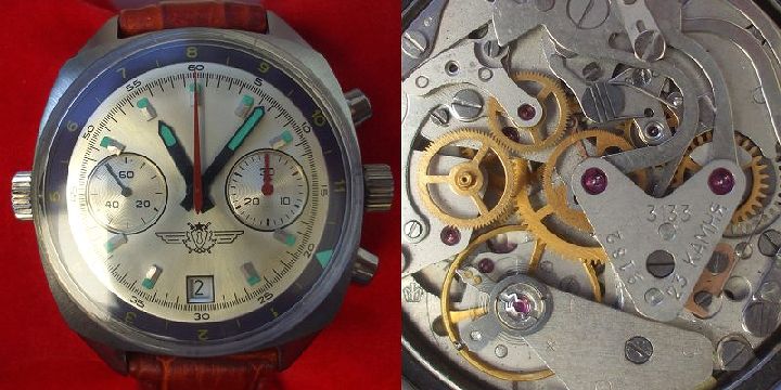 À l’origine, ce nouveau mouvement 3133 ne se trouvait que dans les chronographes Okean (Океан, « océan »), réservés à la marine soviétique. Ils présentaient un design unique, tout en acier, avec un fond de boîtier spécial estampillé ВМФ Командирские, (commandant de la marine). Les autres caractéristiques comprenaient une lunette intérieure permettant de suivre les doubles fuseaux horaires (contrôlée par une couronne à 9 heures) et un anneau de chapitre télémétrique qui était calibré en miles nautiques. En savoir plus sur les OKEAN