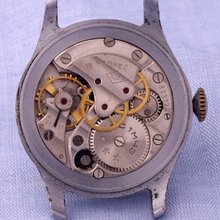 Mentions sur le calibre : n° de série (833221) sur un pont, troisième logo de l’usine (initiales 1 ГЧЗ dans un losange) et 15 камней (15 rubis) sur un autre.