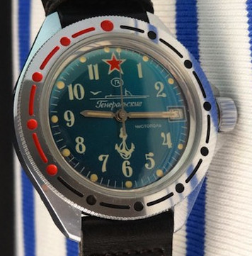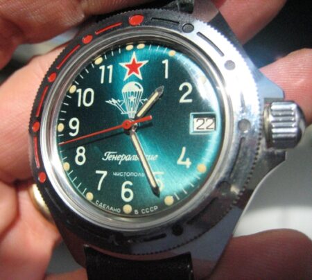 Ce modèle est destiné à l’exportation en Italie. Il s’agit en fait de la classique Komandirskie sous-marin à laquelle a été apposée la marque Generalskie. La production de Generalskie « italiennes » a commencé en 1989 et s’est prolongée jusqu’en 1992. Les premières portent donc la mention « fabriqué en URSS, comme celle-ci: