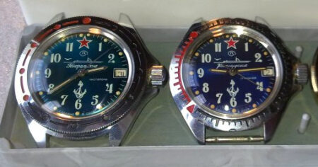Il en existe aussi avec un boitier plus important, type 091, et emboitant le mouvement automatique k 2416. A gauche, une Generalskie italienne 2416/091, à droite la Komandirskie classique: