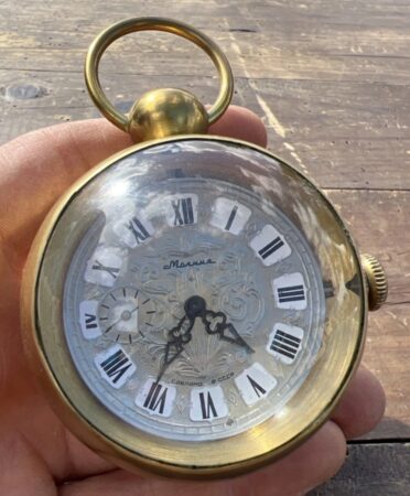 L’adaptation de cette Molnija en montre globe (montre de bureau, presse-papier) n’est probablement par le fait de la fabrique de Tchéliabinsk. La question reste ouvert s’il s’agit d’une série produite par une autre manufacture (un peu comme des ZIM ont été montées en horloge de table « Pagrandukas« ) ou s’il s’agit d’une production artisanale très soignée.