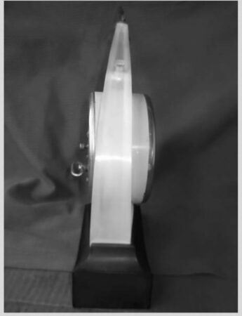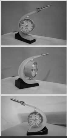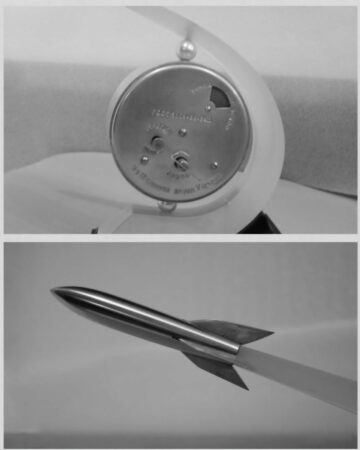 Le mécanisme est logé dans un boîtier rond à bords anodisés recouvert d’un couvercle anodisé. Sous le verre convexe se trouve un cadran avec des chiffres anodisés appliqués ou un cadran squelette anodisé. Les aiguilles de la montre sont anodisées et profilées. Le corps est fixé à un support, ainsi qu’à un montant de fusée en plexiglas, au bout duquel est fixé un modèle de fusée.