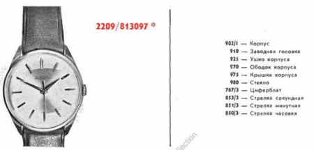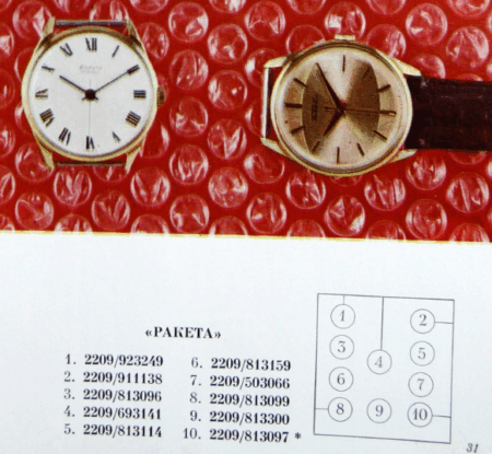 Marquage sur le mécanisme: n° de série sur la platine, 23 камней 2209 et logo Raketa sur le pont.