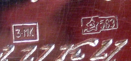 Boîtier en or (poinçon 583 au dos – voir ici pour les poinçons soviétiques) à fond clipsé, avec le n°116659.