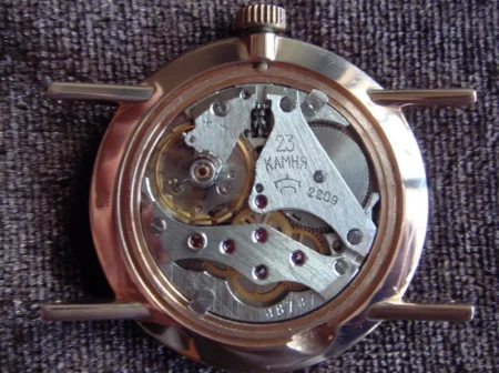 Marquage sur le mécanisme: n° de série (98787) sur la platine, 23 камней 2209 et logo Raketa sur le pont.