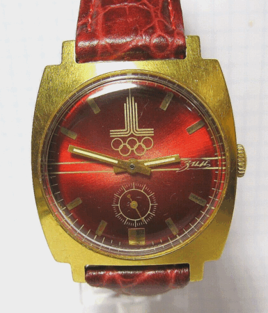 Montre bracelet, mécanique, à petite seconde, de la Fabrique de Montres Maslenikov (ZIM) célébrant les Jeux olympiques de Moscou de 1980 avec le logo des Jeux.