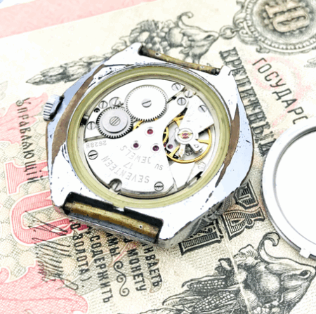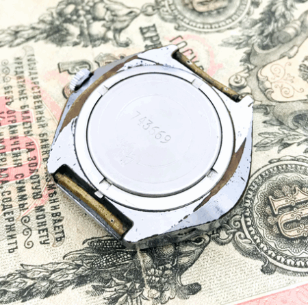Marquage sur le mécanisme: SEVENTEEN 17 JEWELS 2628H et SU (Soviet Union) sur le pont, logo et n° de série sur la platine